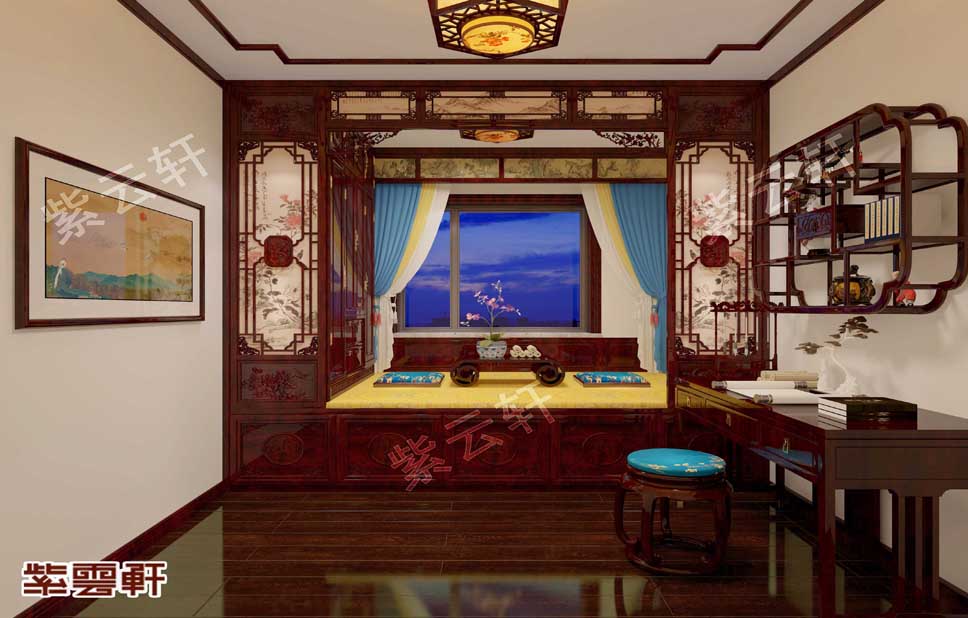 来到暖阁,一张典雅榻榻米、一张书桌、一幅雅画营造出一处韵味不俗的中式空间,再焚起一炉香,摊开一张宣纸,精心题诗一首,真是雅致至极!