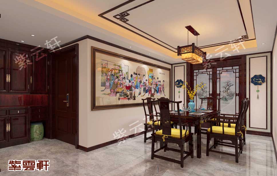 餐厅流畅的线条勾画出典雅的空间轮廓,红木与大理石台面交融,衍生出和谐而丰富的空间视觉,纹理中充满着流动感,为空间增添了温暖又舒适的用餐氛围。