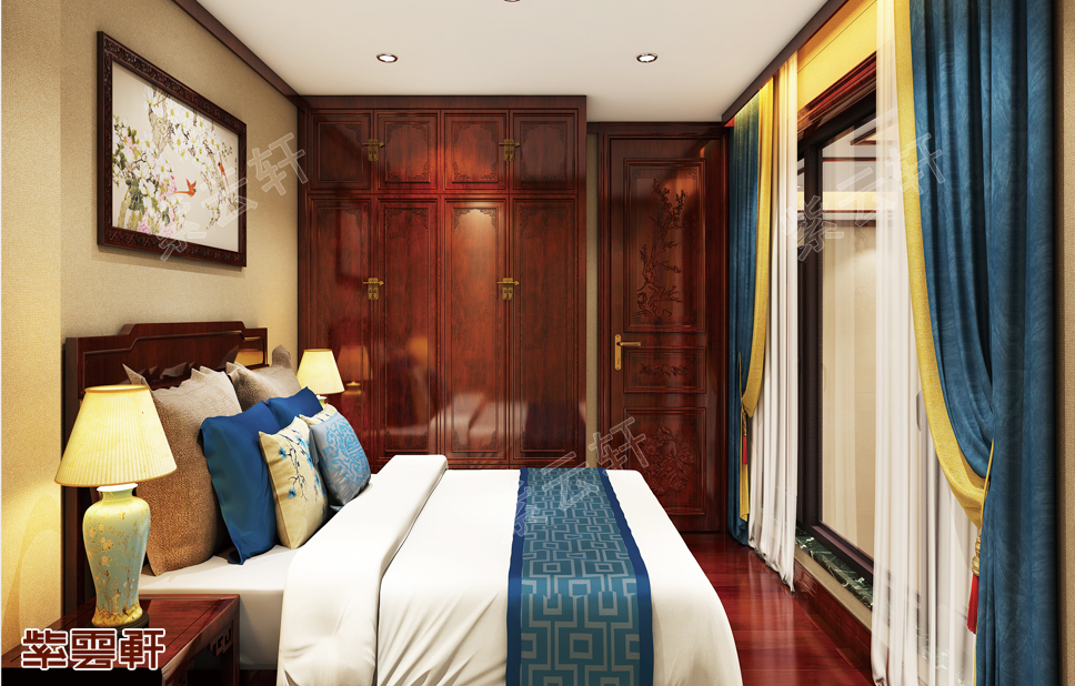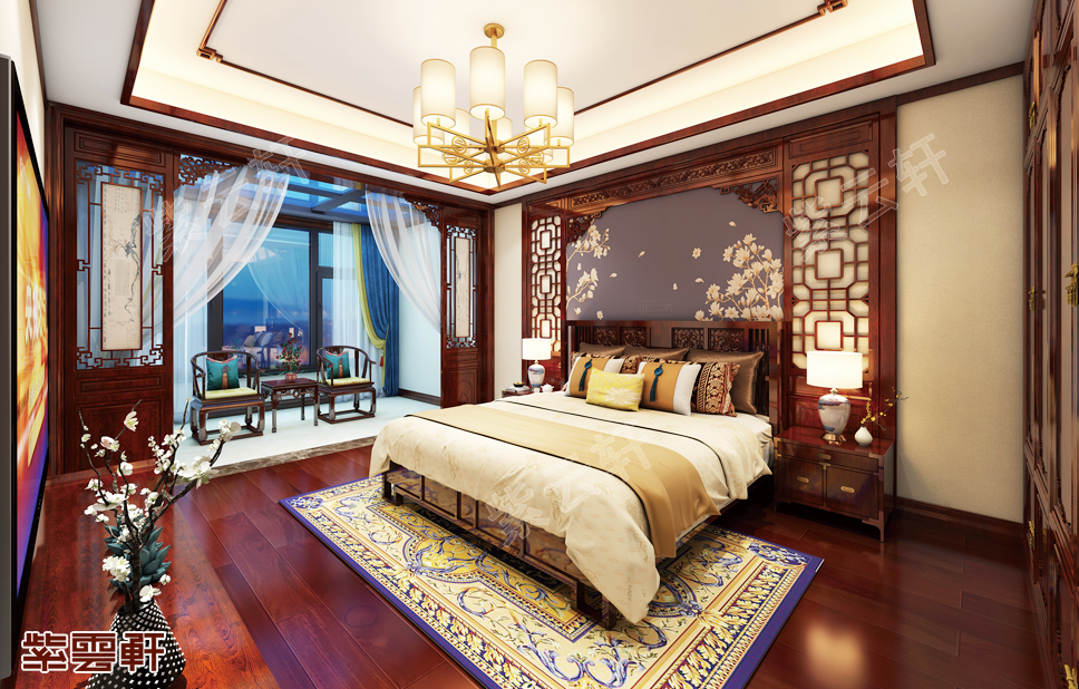 二层主卧中式装修,站在门口就能感受到那华贵典雅的气息,一张黄蓝花纹的绒地毯放置于红木床下,电视柜以一瓶雅花装饰着,诗境、禅境、意境,每一个中式元素都为卧室空间注入凝练唯美的中国古典情韵。