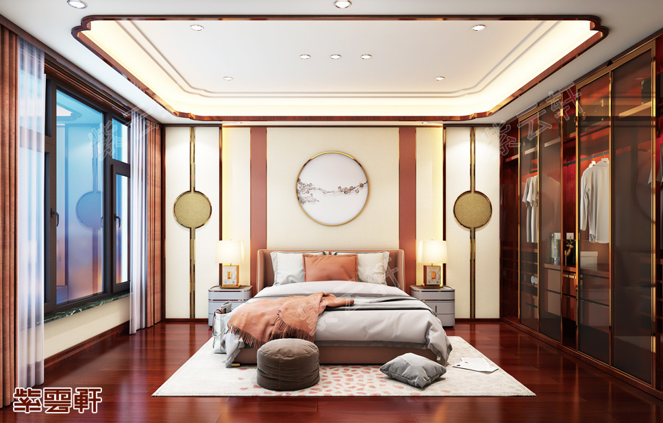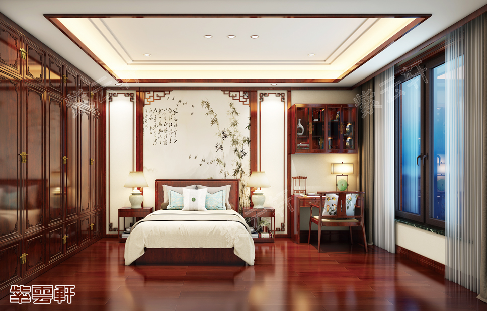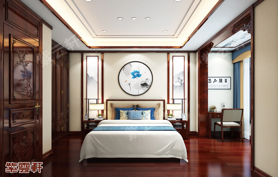 一层次卧给人一种出入云端、云霞下落而藏屋宇的幽静之美,细看每一件红木家具,那质感的纹理、那精湛的雕工,真是富丽贵气流露于每一个像素,修为涵养见于细微之处。