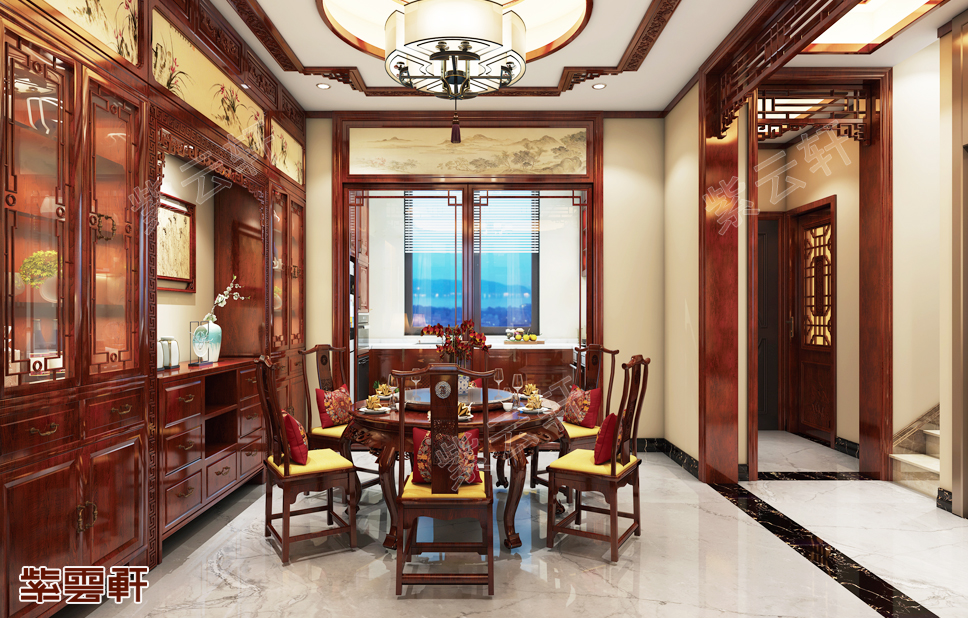 一层餐厅出落得低奢雍容、气韵独特,出尘又入世,尽得山水禅境。只见一张优雅古典红木桌放在大灯之下,一桌一椅皆是能感受到绵婉流长。