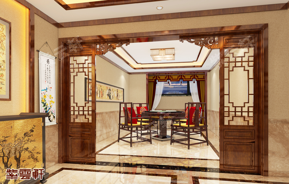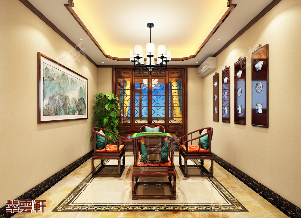 中式装修棋牌室,闲暇的午后,约上三五好友一起放松身心,在一方小小棋牌桌上来一场酣畅淋漓的游戏竞技。