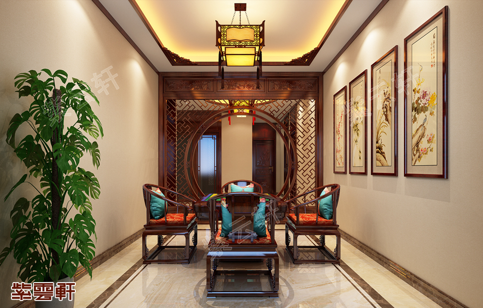 中式棋牌室二,穿过精致雕花的月亮门,便是来到了最适合放松休闲的棋牌室,复古雅致的圆圈椅组合麻将桌带来极致的娱乐体验,墙角处的绿植点缀增添了一丝清新自然之感。