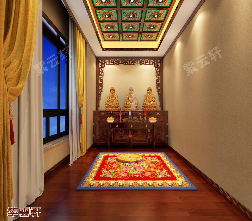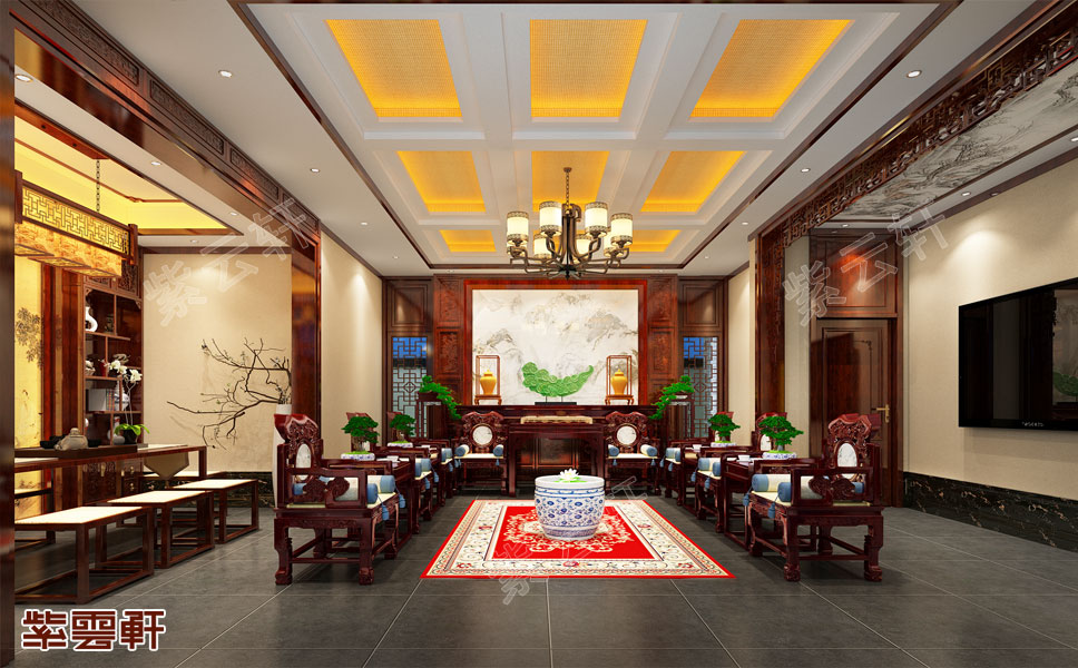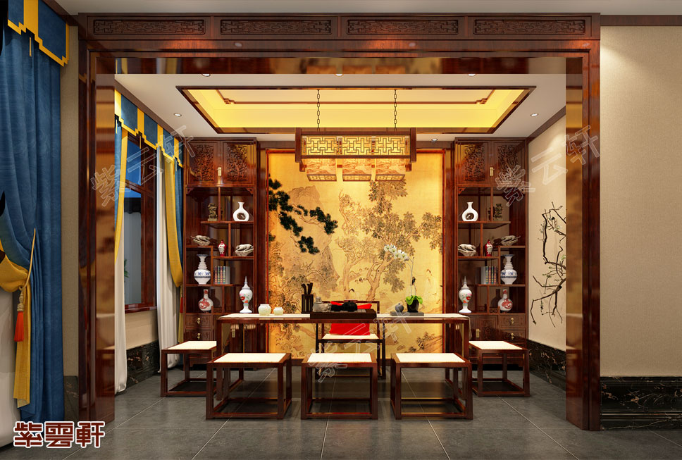 中堂,对称式的布局的中堂,被一种浓厚的古朴雅韵所包围着,格调高雅。桌椅案台各式家具造型简朴优美,色彩浓重而成熟,精美的雕纹上仿佛流转着悠悠古韵,亲切又自然。