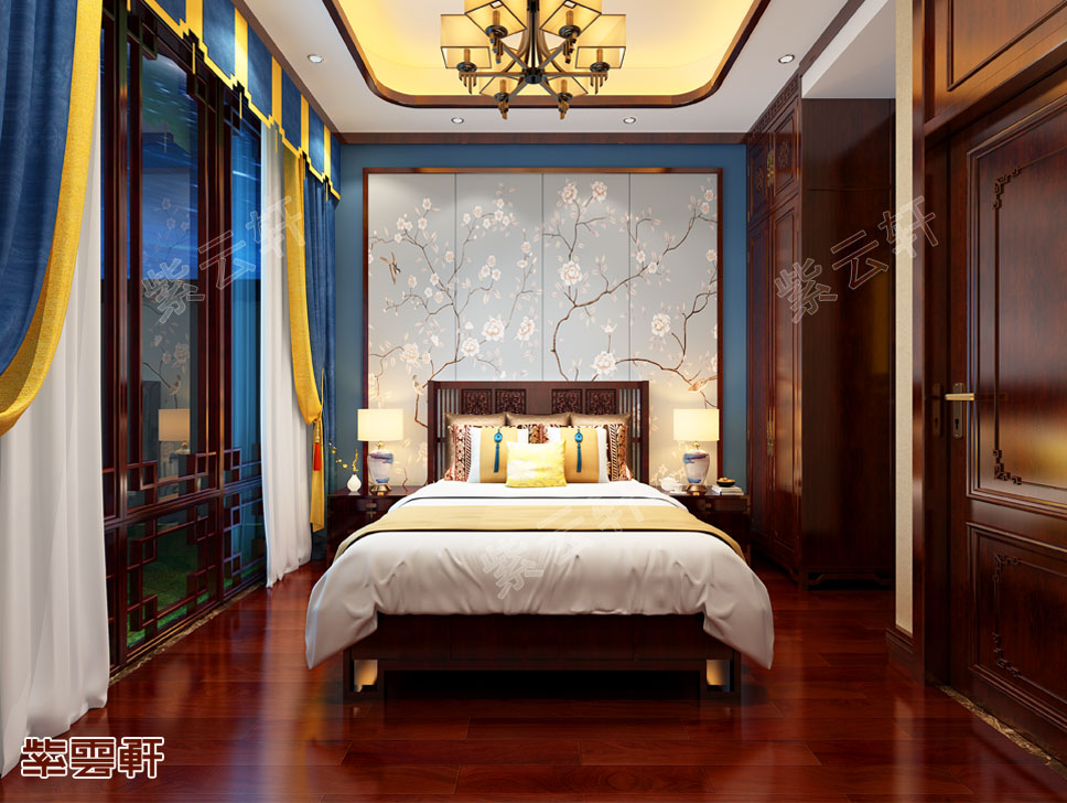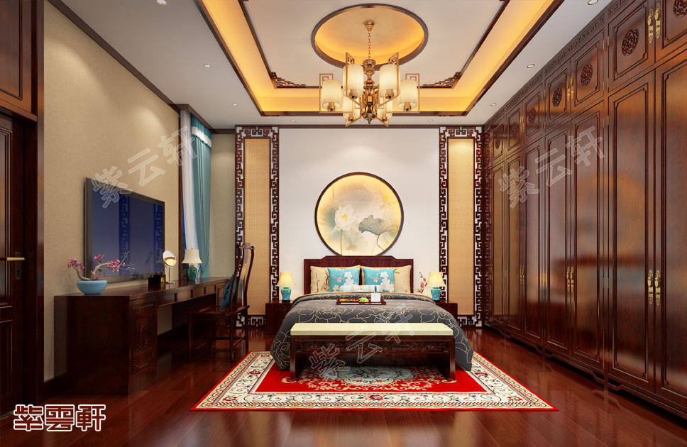 卧室中没有奢华繁复的装饰,精美简约的背景墙满面、光滑细腻的地板橱柜,平和、流畅地塑造出传统文化中的精髓,营造简洁大气又不失高雅情调的居住氛围。清雅的床头灯、舒适的床垫、柔顺的窗帘等,以这些精致的工艺品作为点缀,散发着无比柔和的朦胧美。看到这样的中式设计,让人只想置身在这东方诗意里,回归最真实的恬淡心境。