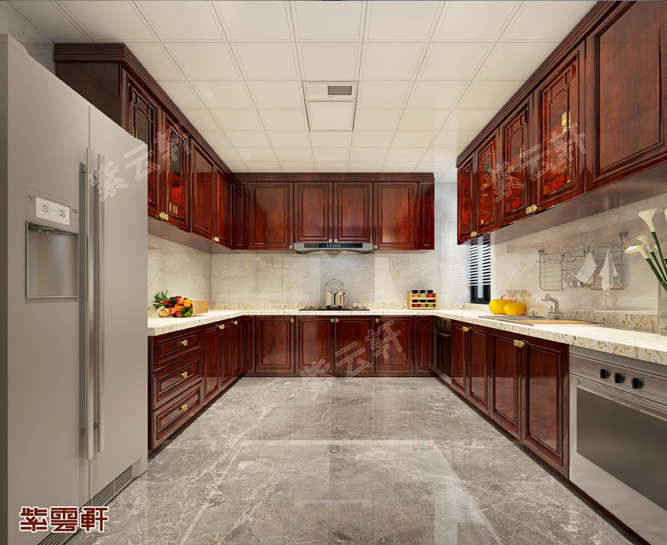 餐厅,以红木桌椅的庄重气质为主,加入瓷器玉器等软装细节装饰,营造出一种自然舒适的氛围感,搭配梅兰竹菊等字画使空间文雅清爽,结合仿古式吊灯有非常好的立体感。