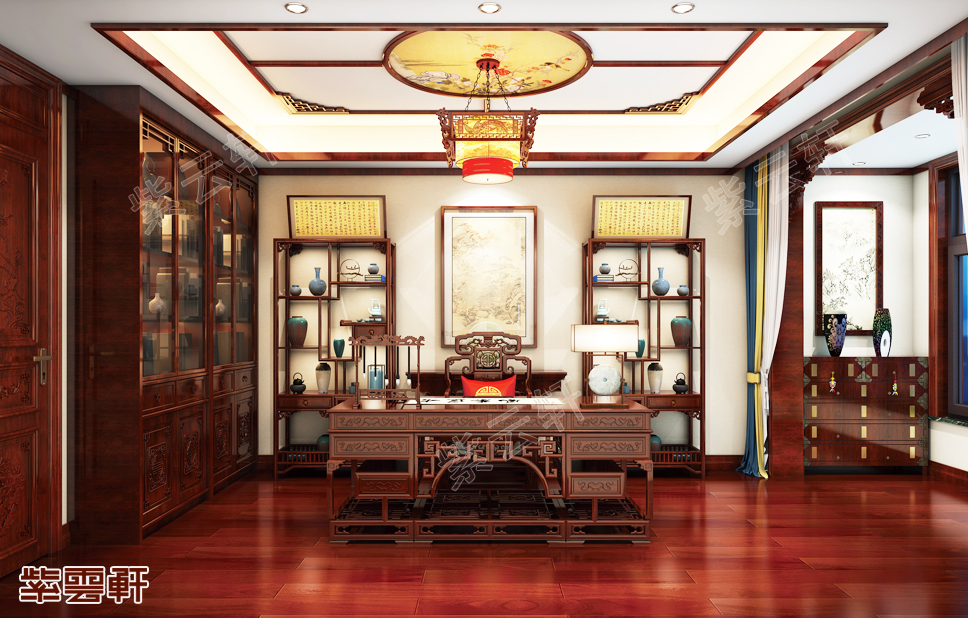 书房,木质书房大气质朴,给人返璞归真的惬意与舒适气息,适合家中各个年龄段的人使用,美观大气、古韵十足。水墨挂饰化繁为简,将文雅的气质与充满历史沉淀的古韵充盈于整个书房中。仿古吊灯优雅豪华,更显示出中式豪宅别有一番古韵。