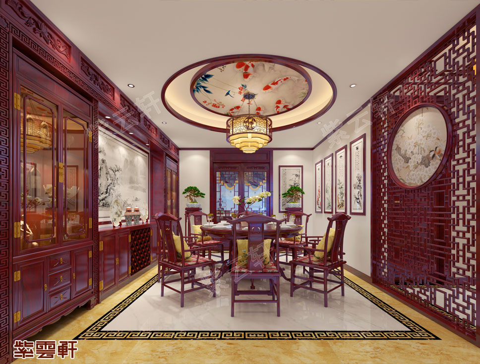 餐厅,镂空的万字栅格作为隔断透视感强,中式特色浓郁,气质不凡的红木桌椅材质细腻,线条流畅。墙面上装饰着丰富的中式挂画,花瓶里的绿植散发着勃勃生机,整个餐厅都闪烁着强烈的古典韵味。