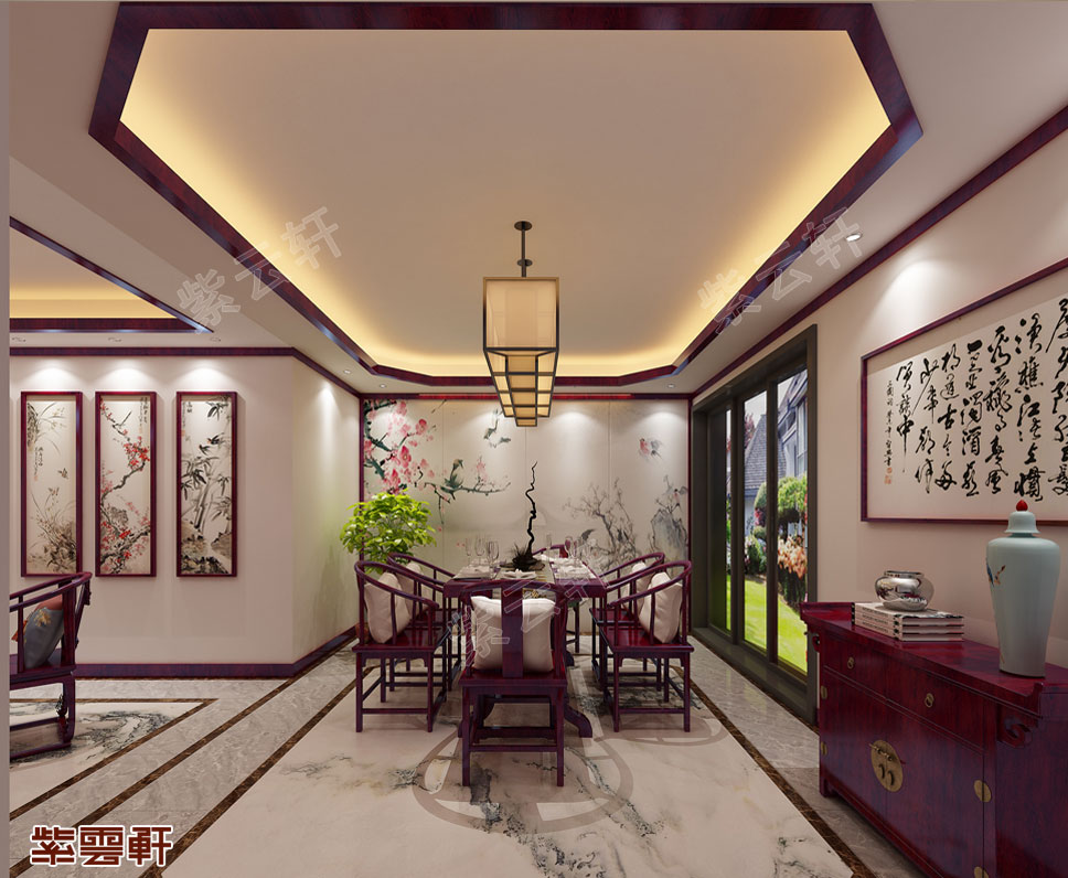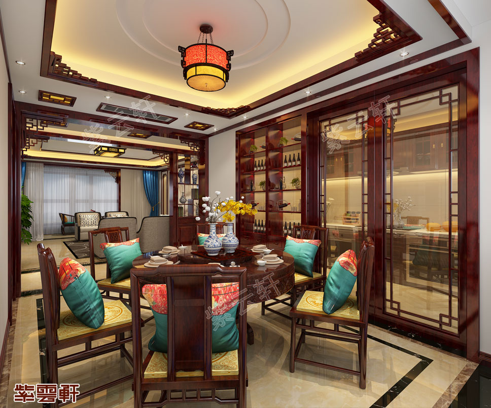 餐厅,由红木打造的桌子,线条简单流畅,触感温润细腻,搭配中式气质慢慢的吊顶显得更加沉稳,给人带来安心用餐的美好心情。
