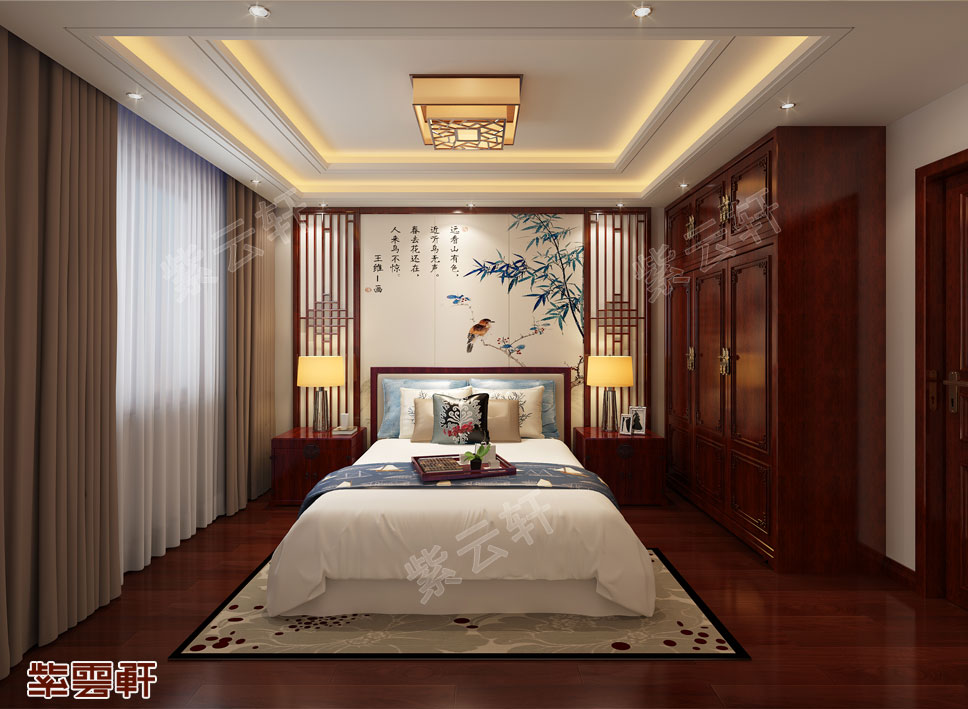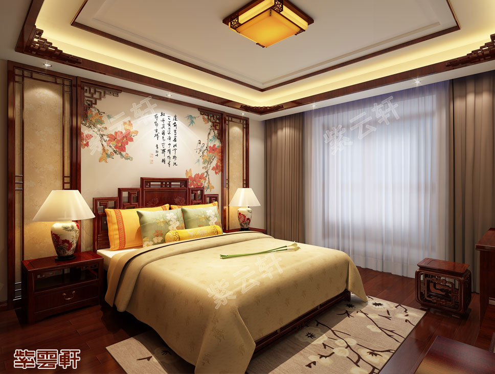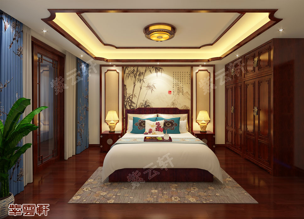 卧室,仿古宫灯充满了宫廷气派,散发的柔和光芒加上红木的天然红色,中暖色的房屋色调让整个卧室显得温馨自然,古色古香的中国风韵舒适而不失高雅,精致而不失大度,将中式装修的情怀表现的淋漓尽致。
