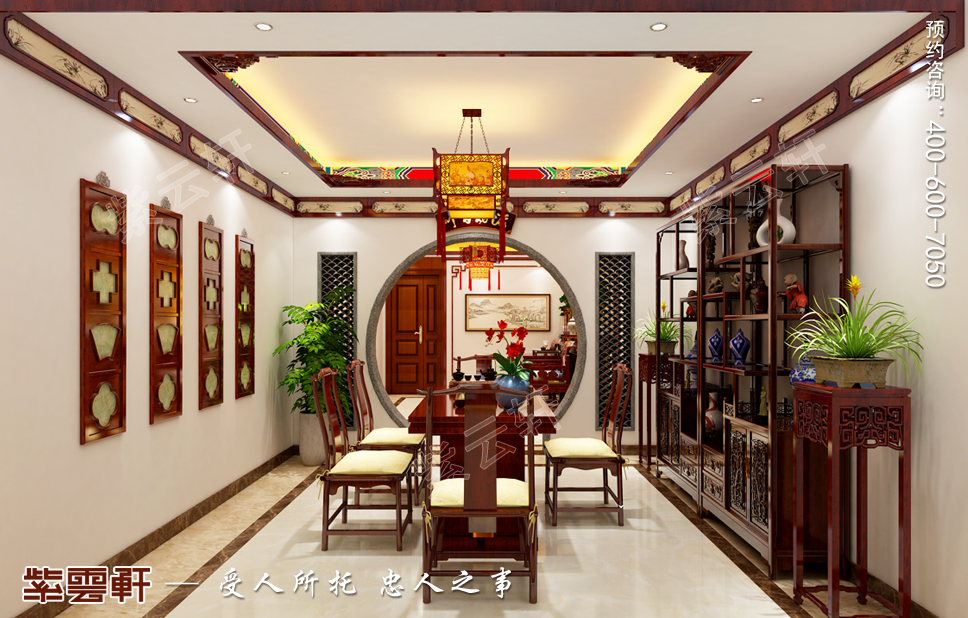 茶室,月洞门的设计空间层次感强烈,多宝阁上的精美瓷器大大提升了茶室的品味。一张茶台,几张椅子,古典的造型高档的材质,极具传统中式风格。