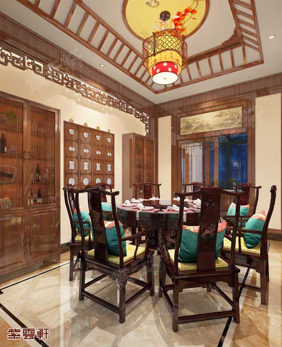 餐厅,组合红木家具流露出端庄自然之感,周边的橱柜中摆满了各色珍藏美酒,让人馋涎欲滴,墙上嵌着的木雕装饰意蕴悠然,一装一饰间尽显中式装修之妙。