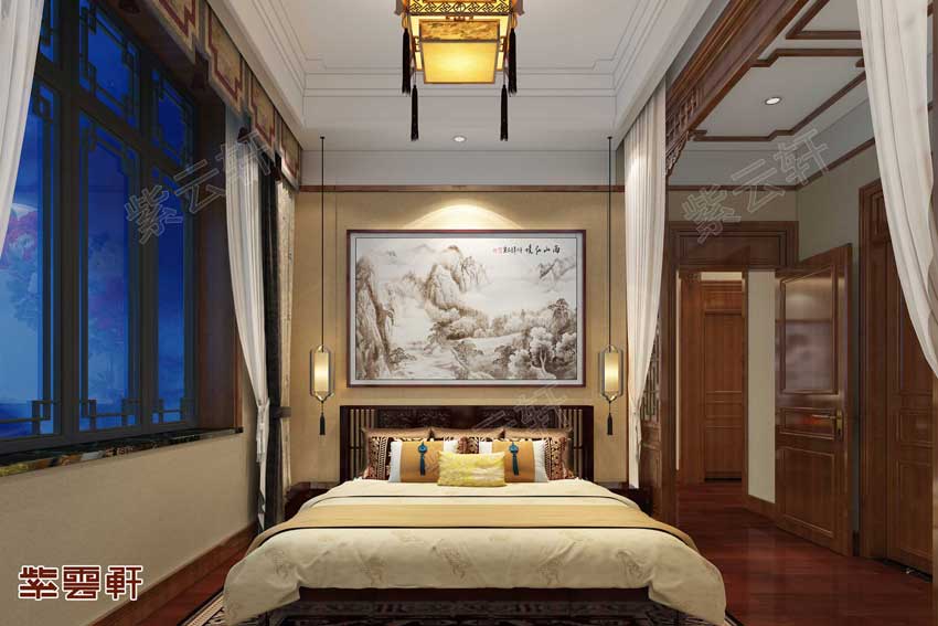 卧室,清爽自然的环境氛围,质朴的檀雕大床处处流露出古典意蕴,床头那副传统水墨画将中式艺术衬映出来,装饰布局间散发中式家装之美。