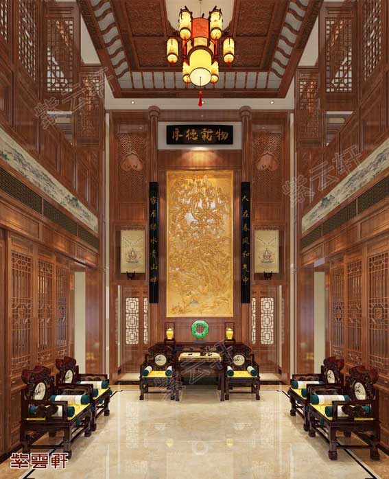 中堂,复式挑高设计,使整个空间看上去更加宽阔,福庆灵芝组合更显庄严,后面背景处一幅精巧木雕装饰点缀,十分古香古色,吊顶上流苏宫灯镶缀,极赋意境。