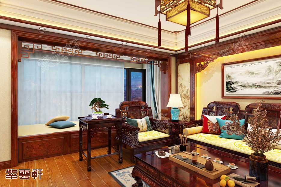 中式卧室装修二,榻榻米床铺极具古韵,床榻上简洁明朗,整扇窗户通透明亮。组合红木沙发家具更衬古香古色,茶几上一套的茶具一应俱全,背景处嵌着的中式装饰极具古典特色,整体上烘托出中式装修的古雅古韵。