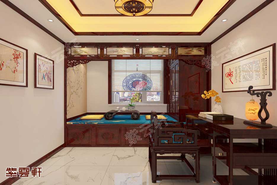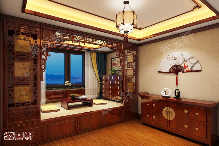 中式暖阁一,红木的布局尽显古典温馨,床头檀雕收纳柜方便实用,一侧回字纹桌椅,古典优雅,极具古色古香,而这也是新中式最流行的颜色。