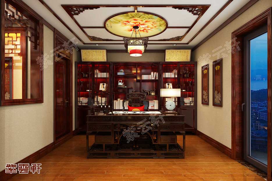 书房,敦厚质朴的组合书房家具,将中式的那份典雅与华贵烘托出来,后面书柜占据了整个背景墙,其中装满了各色名籍,充满书香气质,墙上的木作装饰增添了一丝古意优雅。