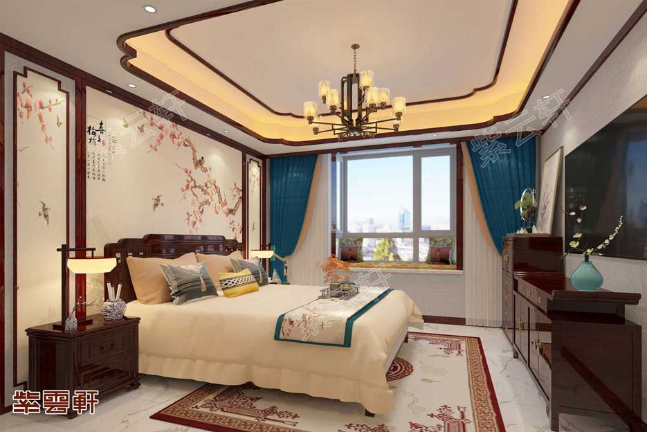卧室,清丽恬淡的装饰布局,将中式的温婉大方之感展现的淋漓尽致,精巧细致的檀雕大床古色古香,背景处的水墨花鸟图温婉灵动极具意蕴,阳台处设置成榻榻米样式温馨惬意,方便观赏窗外美景,房间的一装一饰尽显中式家装设计的巧妙心思。