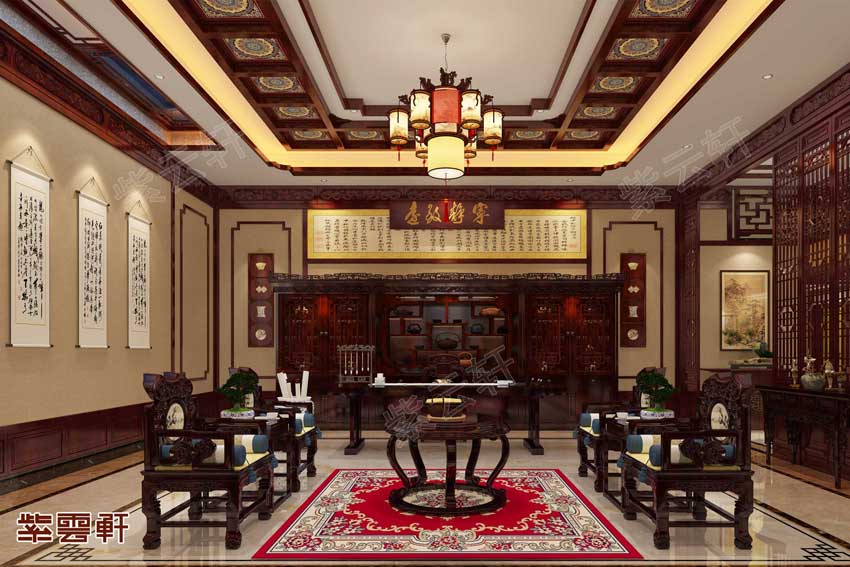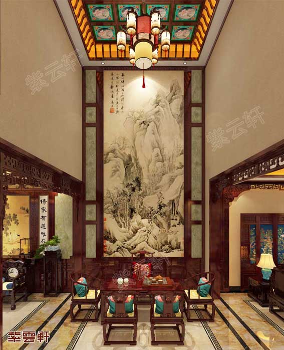 中堂设计四,视野开阔空间极具延伸性,组合红木极具组合尽显端庄雅之感,背景处传统水墨画描绘出一番韵味,棋盘状吊顶极赋雅韵,整体中充满中式设计的雅致韵味。