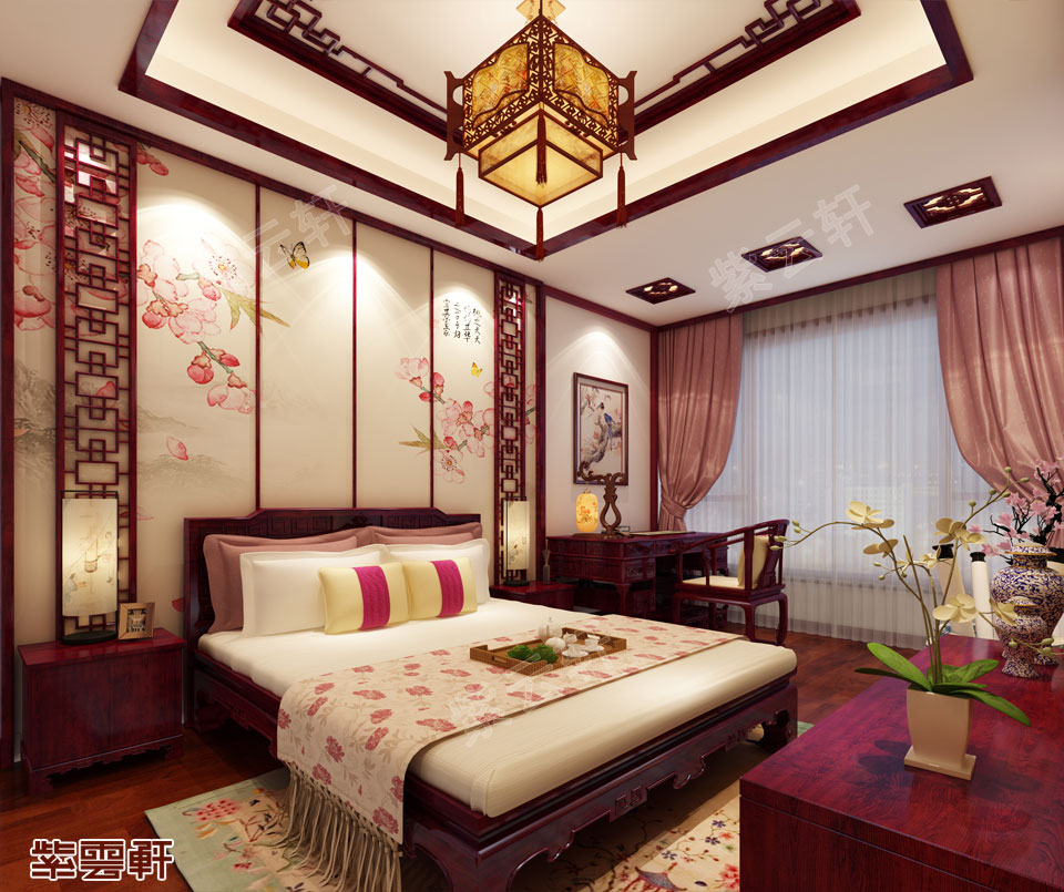 女孩房中式设计,粉红床旗装饰更添温馨舒适,床头清新恬静的桃花勾勒出小女儿家的端庄娴静之感,角落里的梳妆台,展现出了落落大方之感,和整体粉色装饰,氛围感十足,宛如古装剧中千金贵女的闺房般娴淑恬静。