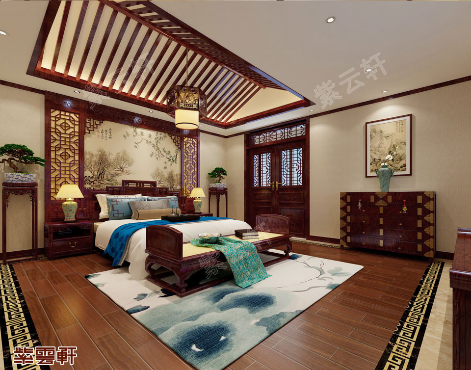 主卧,简约古典装饰端庄大方之感,床头水墨背景表达出来的是一幅传统风景图,精致典雅的床头凳装饰,典雅大气,晕染地毯稍显深邃苍劲。