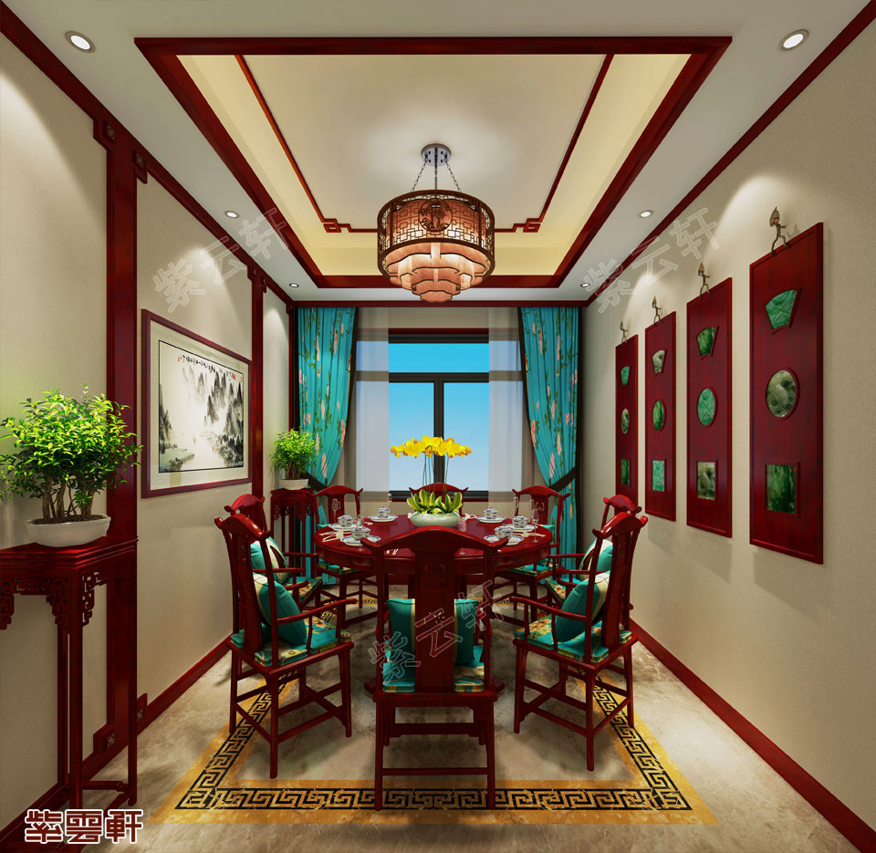 餐厅,素面官帽椅组合烘托的整体上尽显中式装修的富雅,亮眼的配色,整体上增添了另一番风味,墙上的木雕书画优雅的大气,简约清爽的整体氛围,极赋旧时富贵人家装饰布局。