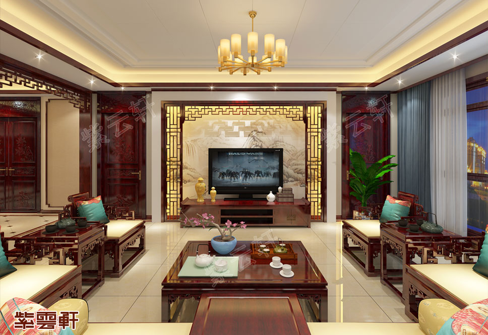 客厅,回字纹沙发组合将古典技艺展现的丰富立体,简约质朴的红木雕刻装饰更是端庄雅正,犹如宫心计中婉约大气的房间装饰。