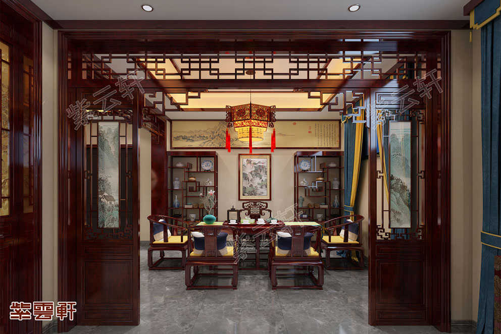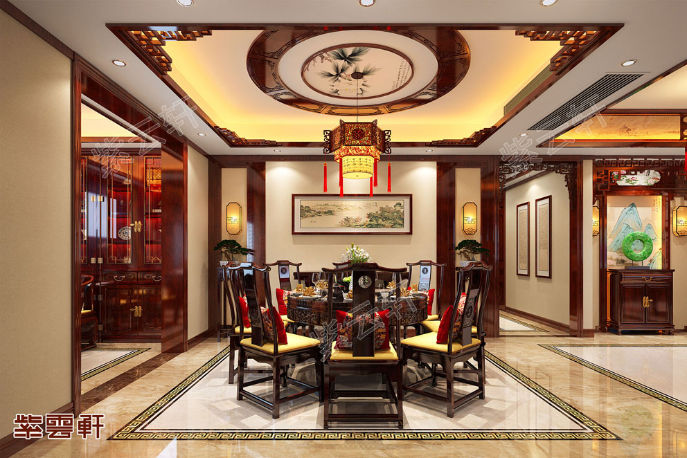 餐厅,官帽椅八宝餐桌极赋中式古典魅力,藻井处流苏吊灯古典华丽,尽显中式宫廷之风,一装一饰中将古典风尚展现到极致。