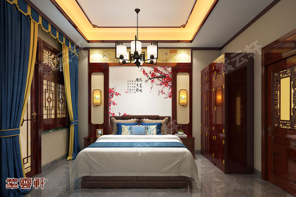 卧室,简约复古的床头装饰充满古典气质,背景墙上自然婉约的梅花图流露出清冷魅力,房间装饰古香古色,仿若进入了旧时千金贵女的闺阁般。