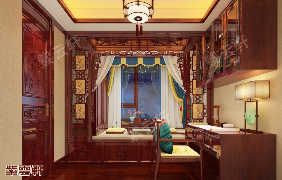 古典暖阁二,整体红木装饰优雅华贵之感充分体现出俩来,一侧的学习区装饰古香古色,壁挂式书柜十分自别致,充满温馨。精心布置的暖阁是家庭装修设计中的一大特色,一间充满文化气息的独立空间,让生活更有口味。