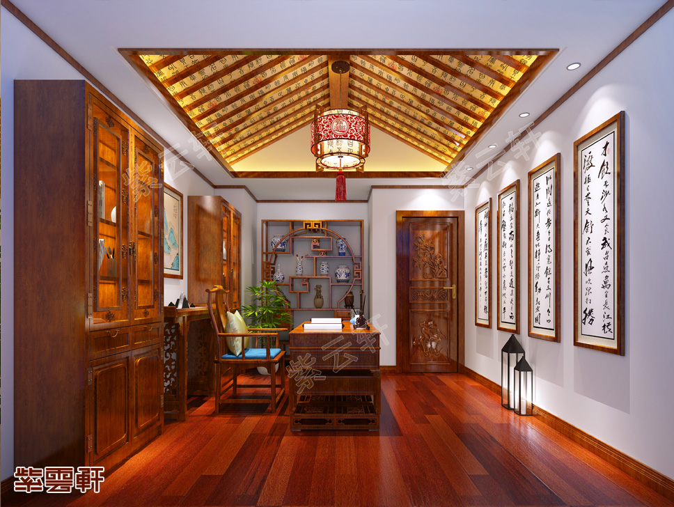 书房,中式现代简约装修风格,铺一笺素纸,研墨提笔,颇有“色侵书帙晚,隐过酒罅凉。”之感,由此卧听风澜,体味文人雅致。古典书法字画展现文艺素雅情调,在中式装修中,墙面上的书法、博古架上的瓷器,都是不错的装饰品,更可谓是完美的搭配。