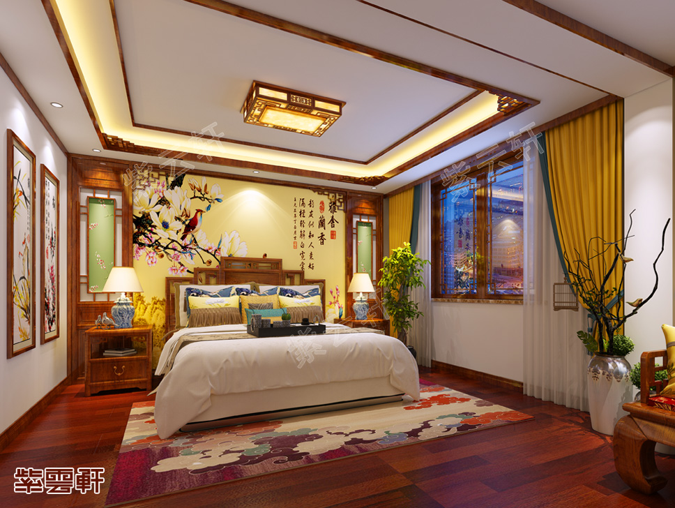 主卧,床头墙面选择中式古画来展现,看起来非常恢弘,更突显出了中式韵味,台灯看起来也十分复古,让传统中式融入现代空间。中式家装风格设计层次感鲜明,每个装饰都起到不可或缺的作用,一盆绿植都有其独特的存在意义。