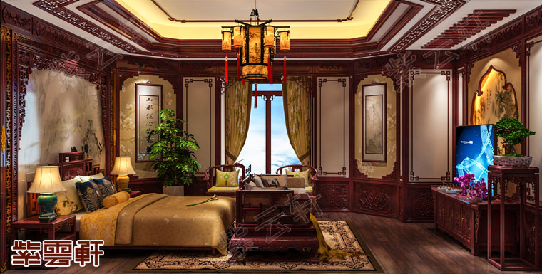 主卧,灰棕色绸缎床带着优雅的色系,搭配豪华的红木大床,古典馥雅的背景水墨画将古典之风采展现的十分传神,寥寥几笔勾勒出灵韵十足的画作,与充满传统色彩的触屏相呼应,温婉经典的宫灯衬映出一种端庄娴静之感。