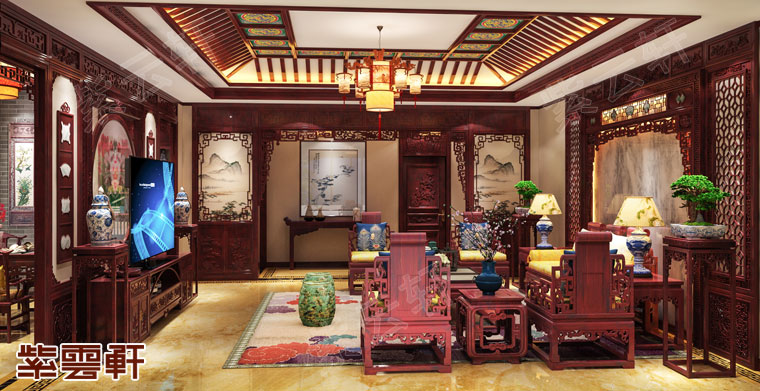 客厅,红木围边靠背组合座椅使古典气息更升一层次,影视墙中绘制了一幅花开富贵的景象,周边木雕装饰皆具设计感,一装一饰中尽显古典风韵。正是这些质朴的古典元素,让中式装修具有大而不空,厚而不重的高雅情调,在这样的空间里面呆着就非常的舒服。