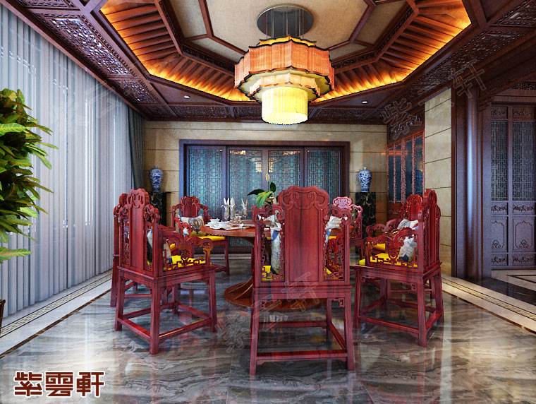 餐厅,国色天香八宝圆桌组合极为华贵婉约,精致的餐具彰显人们对生活品质的追求,造型别致的藻井处嵌着一盏华美宫灯,极具特色,再加上整体的红木装饰,每一寸都经过了精雕细琢,让人感叹中式设计的巧夺天工。