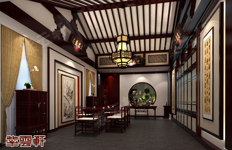 茶室,现代简约风格的桌椅组合线条硬朗流畅,闲暇之余在此品上一杯茗香堪称幸事,周边丹青水墨十分雅致温良,让心情回归平静,优雅的氛围往往通过书法来进行装饰,更能展现神采、气韵、意境,棋盘状吊顶上嵌着的古典宫灯美轮美奂。