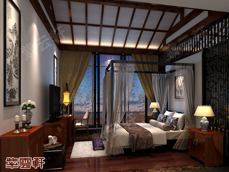主卧,线条流畅的架子床尽显灵韵轻姿,现代中式风格装饰的房间内景充满自然清丽之感,线条流畅的木作装饰极赋韵味,化繁为简,用最深的设计内涵,给人一种宁静致远的感觉。