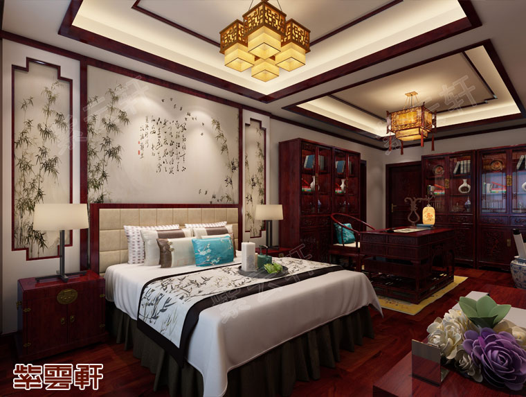 主卧,清雅古典的床品装饰与背景画相衬映,苍翠挺拔的绿竹形象跃然纸上,书房卧室一体设计,有各自的独立性,环境也更加的理想,书房区的设计质朴温雅,将中式风韵发挥到极致,加上整体色调统一的棕红色,豪华又有古典韵味,整体设计效果将住宅中式装修的舒适、雅致、轻奢表现的十分透彻。