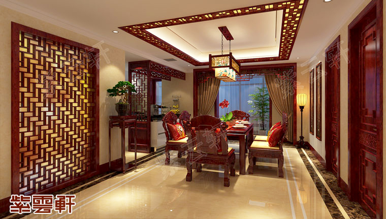 餐厅,红木餐桌组合与暖意十足的灯光衬映出无比温馨的空间环境,营造出一种令人心情舒畅的用餐环境,万字镂空木雕装饰给整体只能隔天了一丝温良感。中式家装设计餐厅中绿植的摆放,让古朴之内,拥有了一点时尚的活力感,古典艺术与大自然同在,更在别出心裁的设计。