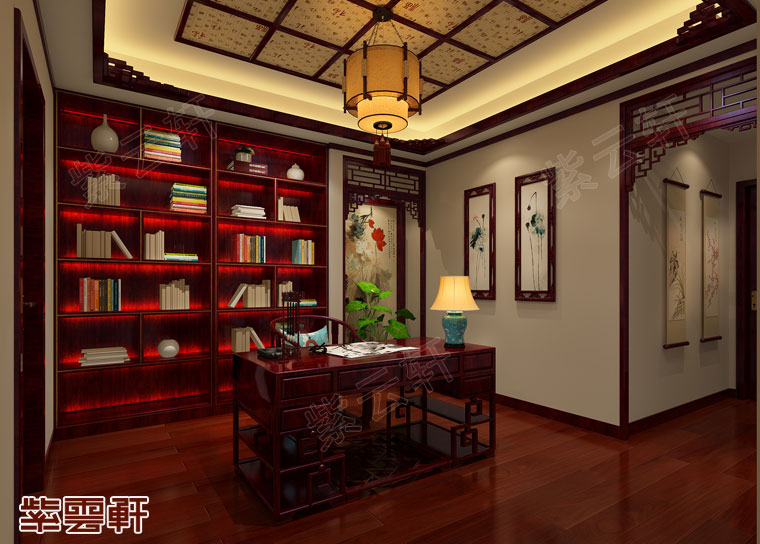 书房,充满文雅书香的布局空间内蕴含了浓郁的古典氛围,红木书架上整齐陈列的各色珍藏,彰显了古典文艺气息,一饰一物中尤显儒雅。