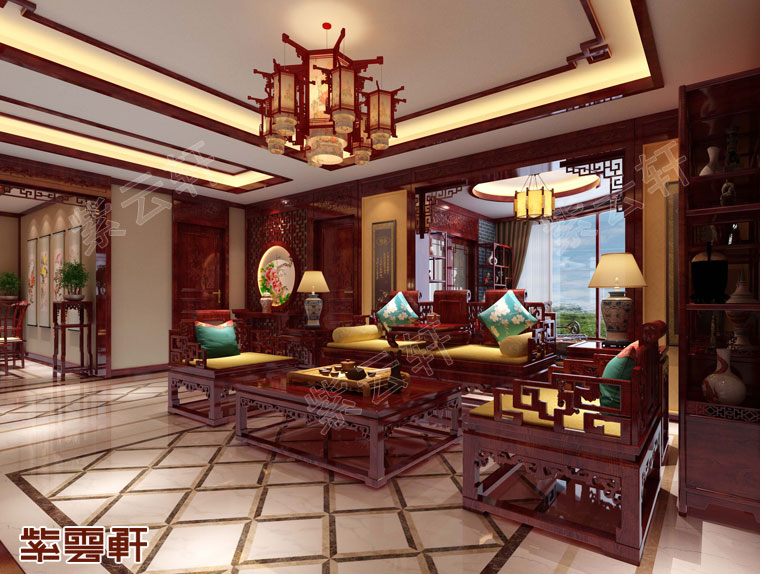 客厅,卷纹沙发组合及尽古典气质,明黄色坐垫带来舒适体验,茶几上的古朴茶具是惬意生活的体验,一雕一刻中享受传统底蕴的升华。中式客厅取传统文化的精华,与现代美学的结合,让中式家装设计拥有质朴的纹理和古雅的意境,铸就了永不过时的东方魅力。