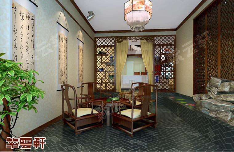 茶室,清雅的环境中茶香四溢的氛围,使人忍不住沉溺于此,侧面的假山池塘皆显风光霁月般雅韵悠长,整体色调十分端庄沉稳颇有风韵。搭配一侧的题诗,内涵极佳,清雅脱俗,每一个装饰都展现中式装修设计茶室的清新脱俗。