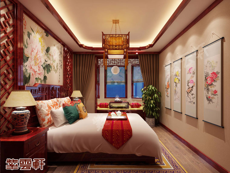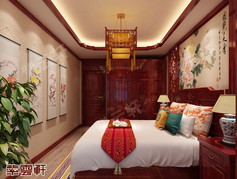 卧室,雕花围板床彰显古典华贵,传统水墨设计使房间整体上更添古雅韵味,周边复古的摆件装饰处处流露着中式风格,一步一景甚是雅致。一侧的红木家装彰显豪华大气有品味。
