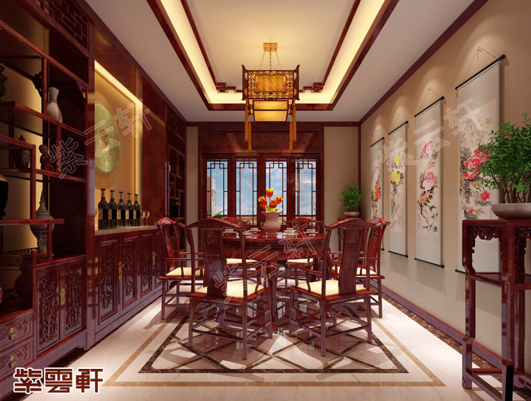 餐厅,素面富贵围板组合后座椅流露出一丝尊贵华美,与流苏宫灯交相呼应形成一道唯美古典风格,中式设计装饰选用的四君子画十分淡雅传神,有着内敛的温存,有着绽放的激情,也象征着我们的生活有激情。