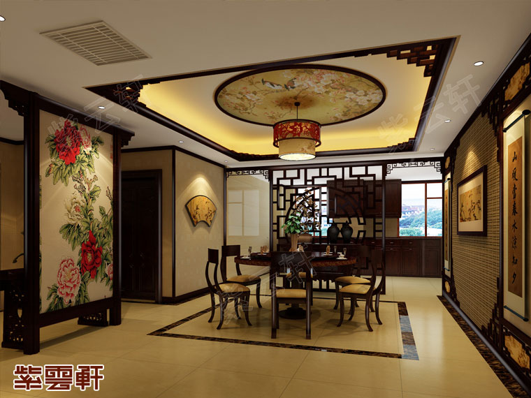 餐厅,组合餐桌十分清雅简约,将整体中式风格衬映出无比精致之感,彩绘藻井处充满古典韵味,牡丹屏风点缀其中使整体用餐氛围更加温馨。