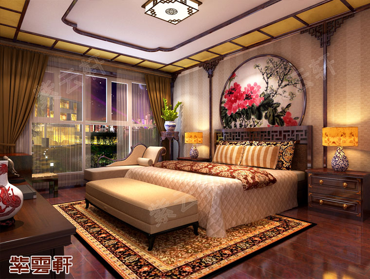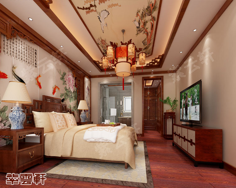 主卧,镂空回字纹大床及尽复古风采,床头古典水墨画与之呼应,形成一种独特的吸引力彰显出传统古典气息,一装一饰中流露出其神韵。