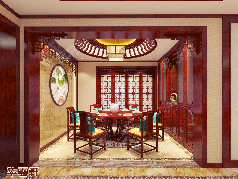餐厅,一张中式圆餐桌搭配古色古香的中式吊灯,墙面设计了一组圆形的艺术造型,红木边框环绕一幅清雅的画作,多种元素组合出一个张弛有度的视觉效果,低调含蓄的东方意境十分迷人。一侧的红木立柜可以用来放一些东西,让整个餐厅十分的干净整洁,更能体现中式设计的豪华与大气。