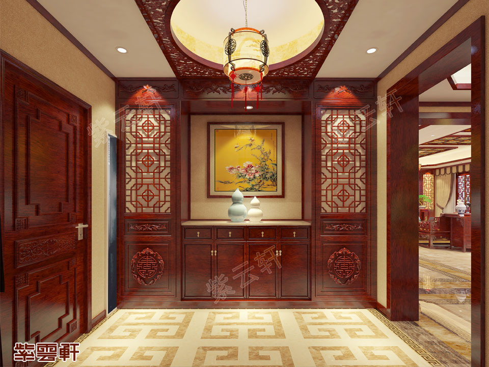 玄关,推开大门,一套精雕细镂的格栅墙板沿袭中式传统的对称之美,惬意文雅的书画点缀高雅又精致。细腻的红木硬包在明亮的灯光线中塑造出一种金碧辉煌的大气质感,扑面而来的中式风情让人不得不为住宅中式装修赞叹。