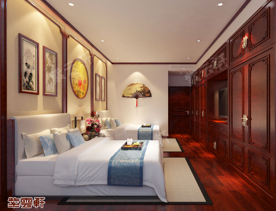 卧室,卧室打造的非常古典,收纳柜选用高饱和色调的红木材质,让整体空间变得非常有中式韵味。天花板采用无主灯设计,照明均匀舒适,层次丰富,看上去非常有档次感。