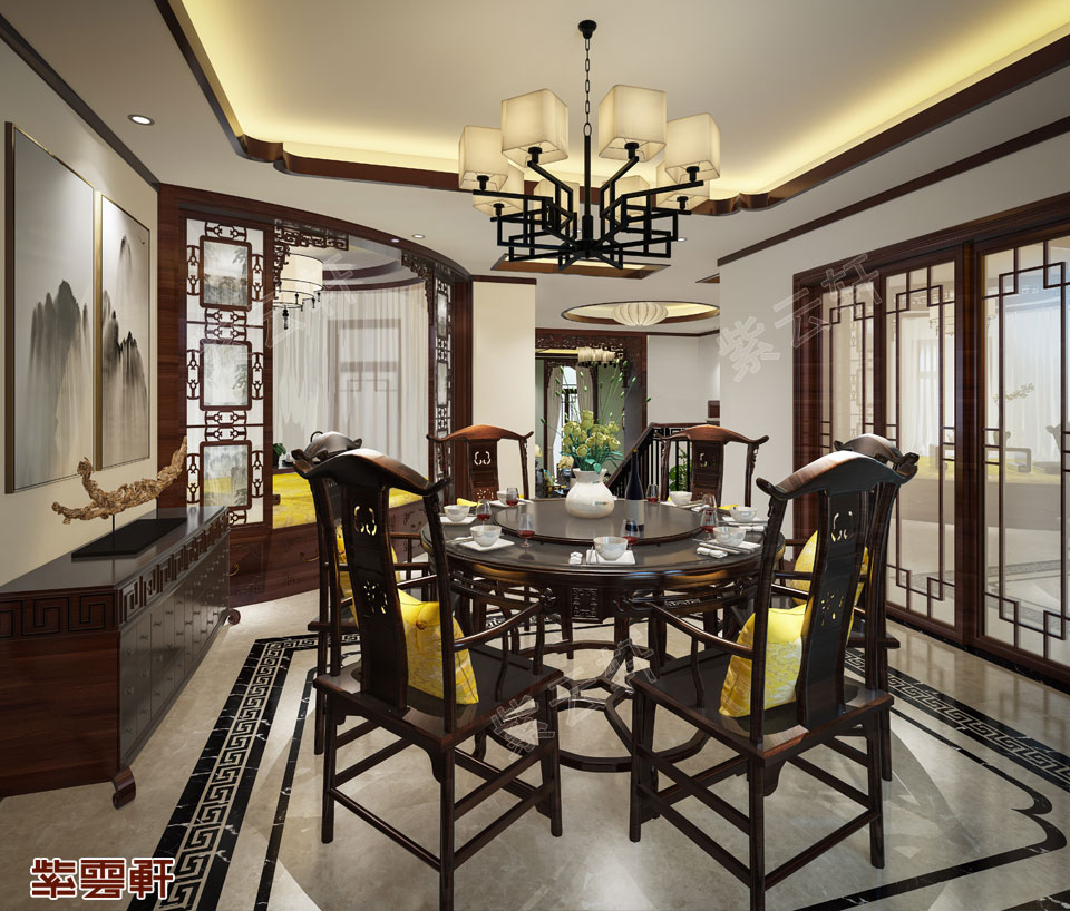餐厅,官帽椅组合充满质朴气息,角落的休闲处设计成榻榻米样式,显得极具独特性,周边艺术性的装饰点缀增添了一丝艺术感,红木餐桌上的插花选用淡淡的绿色叶子,又能与红木形成对比,也可根据季节摆放春兰、秋菊、夏洋、冬红,显得潇洒而又浪漫,令人食欲大振。